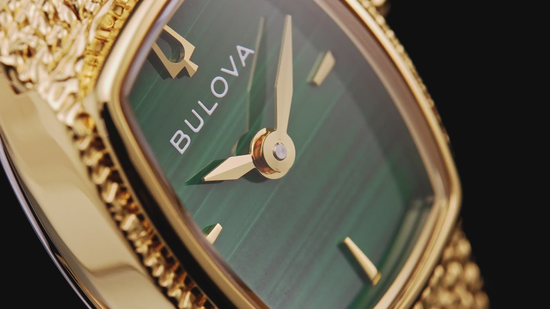 Step back in time to the glitz and glam of the 1970s with the Bulova women’s Classic “Goddess of Time” watch. Borrowing the timeless design of vintage Bulova “Goddess of Time” watches, the gold-tone stainless steel tonneau case has a textured top and a brightly polished bezel, seamlessly transitioning to a textured mesh bracelet with a sliding clasp closure that adjusts from 6″ to 7 ¾″. Each striated green genuine malachite dial is completely unique and is appointed with gold-tone applied markers and matching hands, while Bulova’s Goddess of Time herself is etched onto the case back in intricate definition. Feel truly divine in this stunning Bulova ladies’ timepiece.