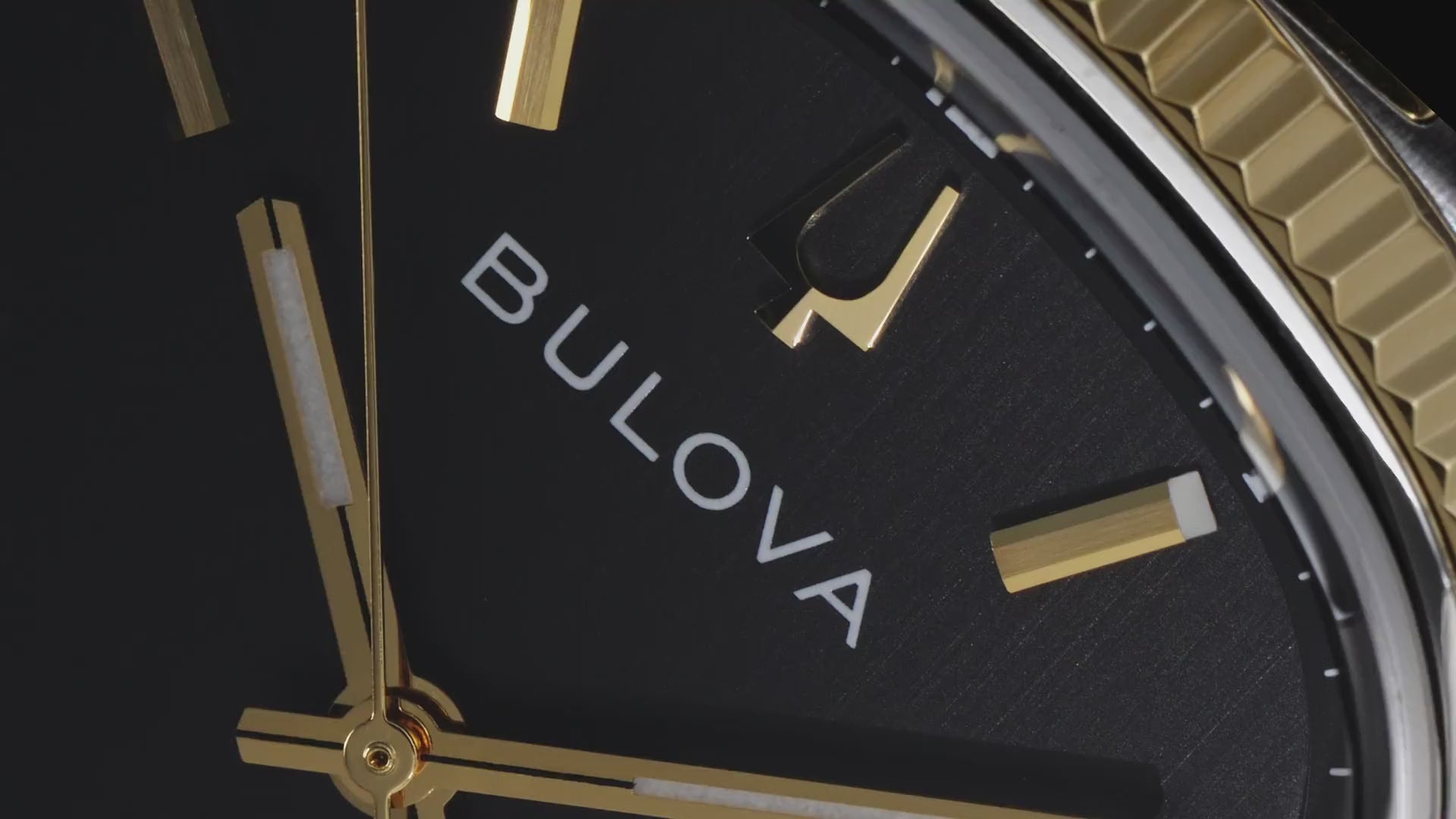 Drawing inspiration from the incredible Bulova Super Seville Day-Date of the 1970s, the men’s Bulova Super Seville merges retro aesthetics with state-of-the-art movement technology for a timeless modern appeal. With versatility for every style, the gold- and silver-tone stainless steel 38mm case strikes a bold stance with a seamless silhouette created by the TV-shaped case transitioning into the integrated 3-link two-tone stainless steel bracelet, which features a push-button deployant clasp. An elegant, grooved coin edge bezel enhances the case and surrounds a flat sapphire crystal and its date magnifier. The compelling dial is a rich brushed black, with polished gold-tone hands and indices and a date situated perfectly at 3 o’clock. The new Bulova Super Seville is powered by our proprietary high-precision quartz Precisionist movement, a revolutionary 8-jewel quartz mechanism vibrating at a remarkable 262kHz, accurate to seconds per year with increased resistance to temperature changes, and with a smooth sweeping second hand. Embrace an effortless kind of elegance with the men’s Bulova Super Seville.